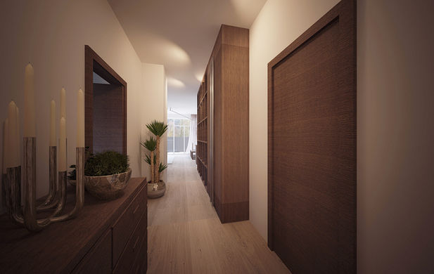 Od developera jsme převzali skelet řadového domu v Roztokách u Prahy, který si vyhlídl mladý pár se dvěma dětmi. Ač byl rozpočet skromější, podařilo se nám klienty přesvědčit, že nejdůležitější investice je tzv. páteř, která se později velmi těžko mění. Páteří pro nás byla fortelná a zároveň svěží podlaha z masivního běleného dubu, dále koupelny a zakázkově vyrobená kuchyň z mědově kouřové dubově dýhy. Tu jsme v interiéru použili i na vestavnou skříň, která tvoří zázermí pro technickou místnost a odděluje od obývacího pokoje schodiště.